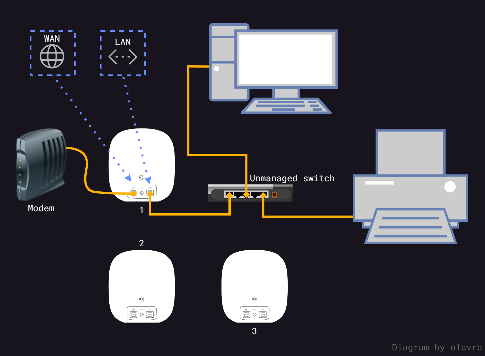 Here are some diagrams I've made to show how one should do wired backhaul with Google / Nest Wifi. The goal was to show it as simple as possible, with the audience being community users at googlenestcommunity.com.